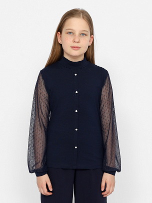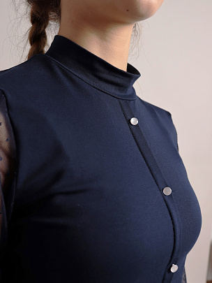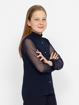 Водолазка для девочки с длинными рукавами и воротником-стойкой. Рукава из сетки с манжетами из кулирки. Полочка с имитацией застежки на пуговицы.