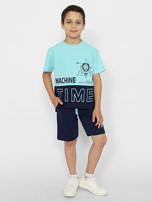 Комбинированная футболка с короткими рукавами. Горловина круглая, обработана узким воротником из полотна с эластаном. Перед футболки с горизонтальным швом чуть ниже линии груди. Перед футболки декорирован принтом "время машин". Шорты с боковыми карманами. Пояс притачной, с резинкой внутри и шнуром.